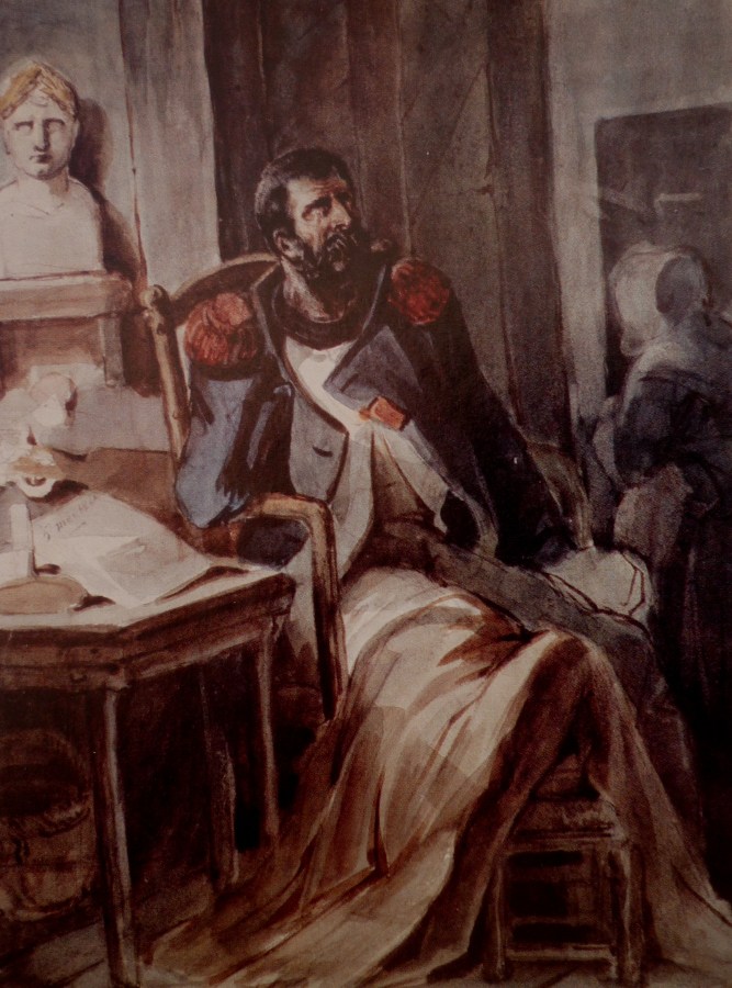 Un ancien membre de la garde de Napoléon, infirme, près d’un buste de l’Empereur. On peut estimer à un million le nombre de vétérans français des guerres napoléoniennes ; parmi eux 10 000 ont fait la campagne de Russie. La figure du mutilé devient familière. Dessin de Nicolas Toussaint Charlet, 1820, Musée de la Malmaison, Reuil-Malmaison.
