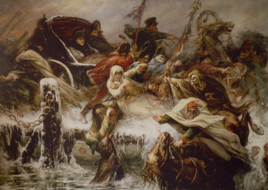 Le 5 décembre 1812, accompagné du général Caulaincourt, Napoléon quitte ses soldats et fait route vers Paris. On lui a appris que, dans sa capitale, un ex-général, Malet, a réussi à désorganiser le gouvernement lors d’une tentative de coup d’État. L’empereur part, en laissant le commandement à Murat. Peinture de Joseph Van den Bussche, 1901, collection particulière.